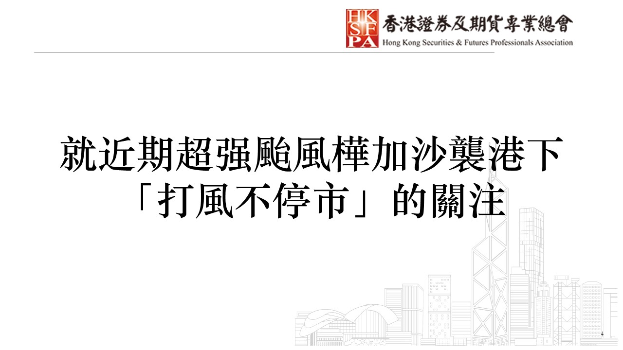 香港證券及期貨專業總會(「總會」)對香港交易所(「港交所」)在即將來臨的超强颱風樺加沙下,仍然維持「打風不停市」深表關注。根據香港天文台預報,該颱風預計於9月23日(週三)最接近香港,屆時帶來風速高達210公里/小時的強風及暴雨,可能為香港帶來嚴重威脅。作為本港證券業界代表,總會強烈呼籲政府及港交所在近期惡劣天氣下考慮暫停香港的證券及衍生產品市場交易,以保障從業人員及公眾的安全。